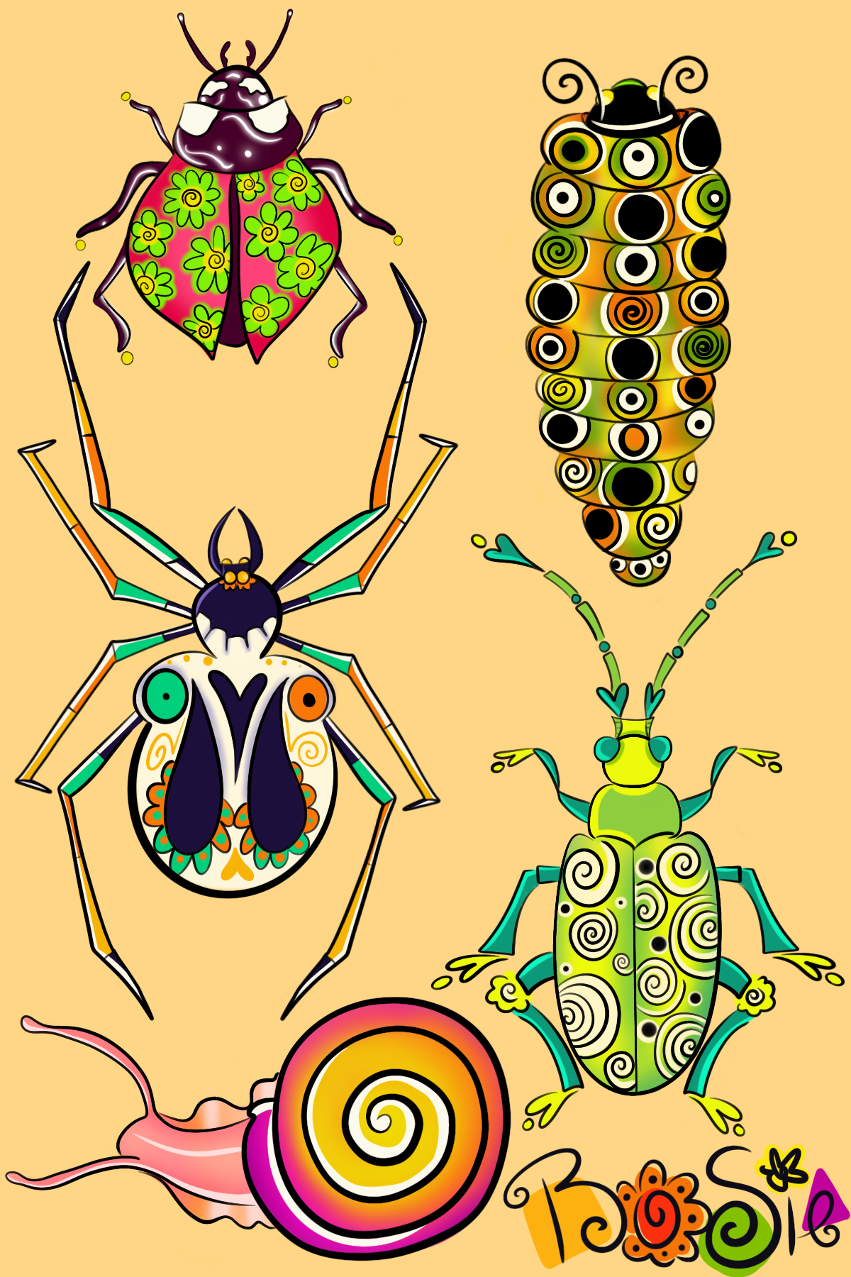 I had a lot of fun making this piece. I wanted the bug designs to be unique, playful, and appealing. My personal favorite design is the skeleton spider.